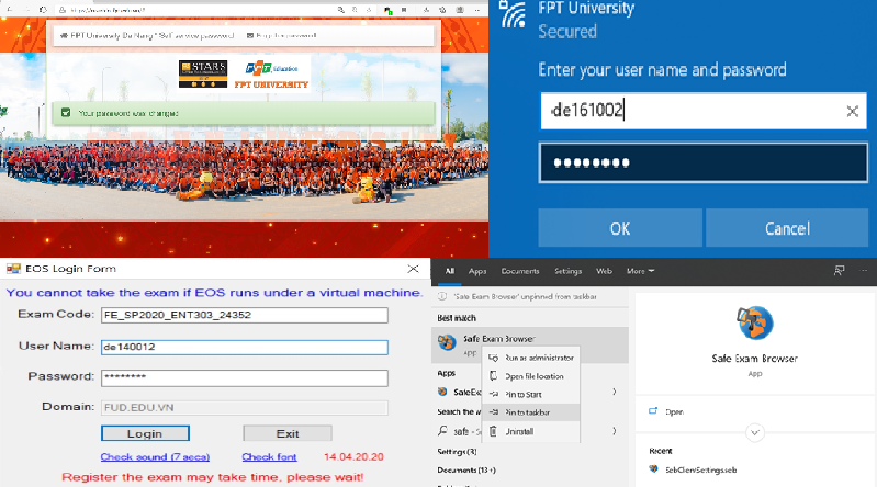 *Mô tả: Khi mở SEB màn hình xuất hiện lỗi Page Load Error khiến người dùng không thể đăng nhập được Cách xử lý: – Tắt phần mềm SEB, kiểm tra và thực hiện kết nối lại wifi – Lưu ý: sử dụng wifi “FPT University” hoặc wifi “Guest”. Không […]