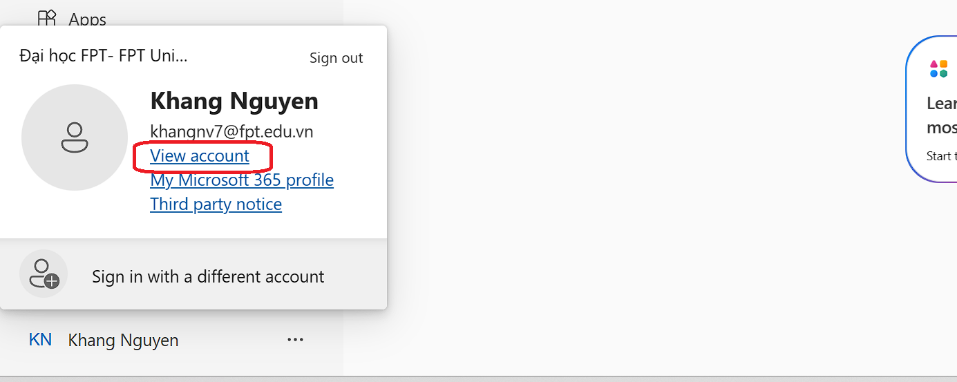 Chọn biểu tượng góc dưới, bên trái – chọn “View account”