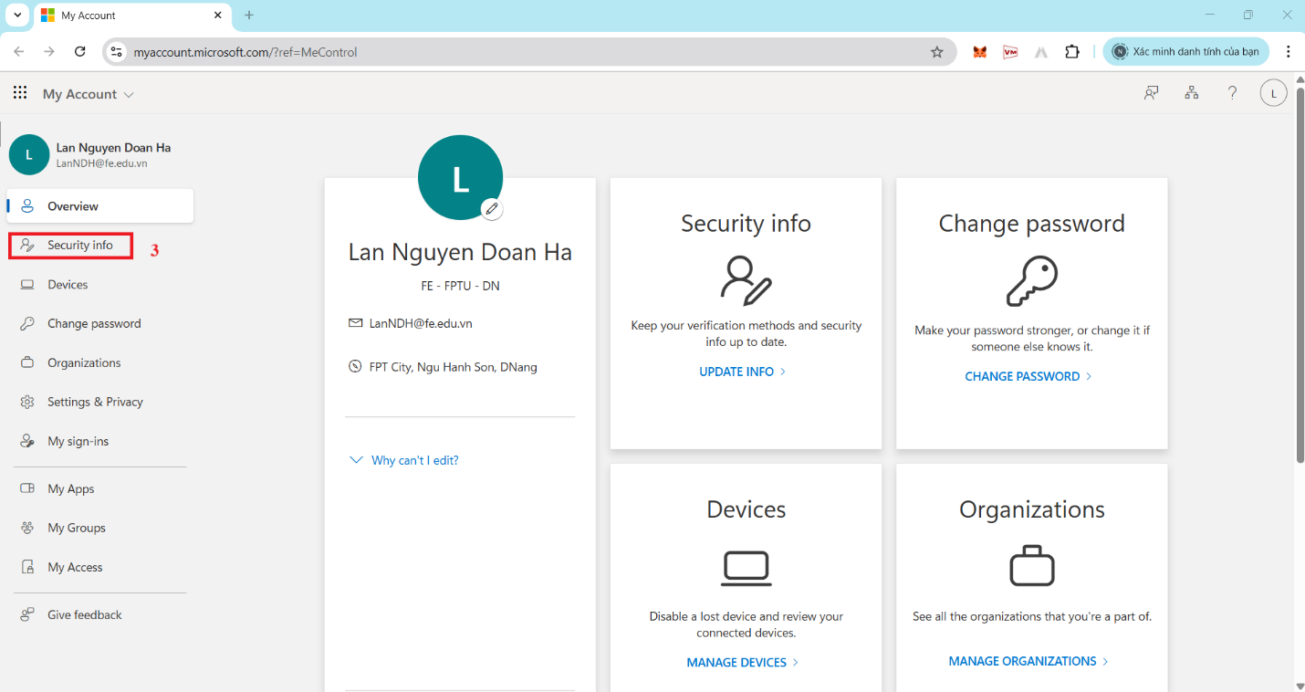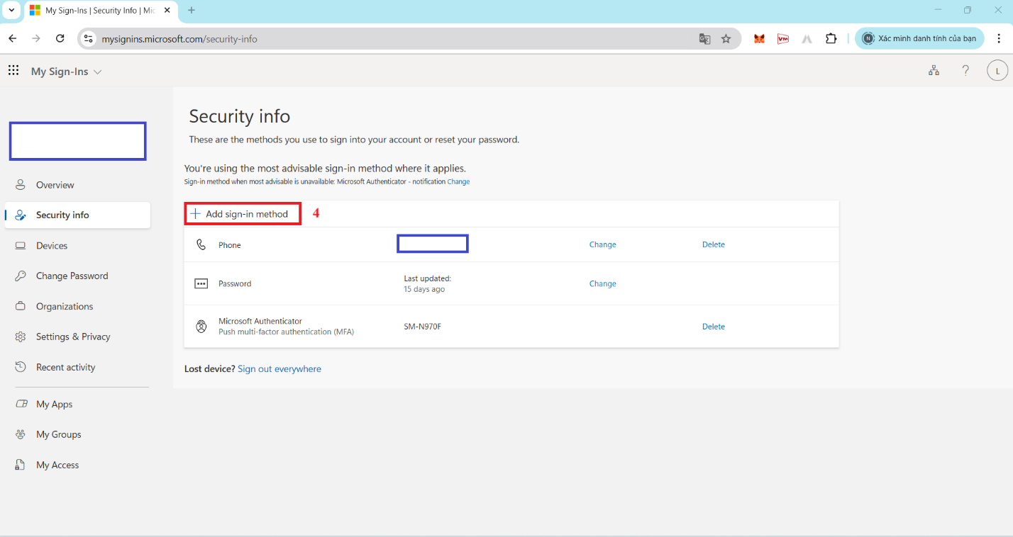 Chọn “Security Info”- Chọn “Add sign-in method”