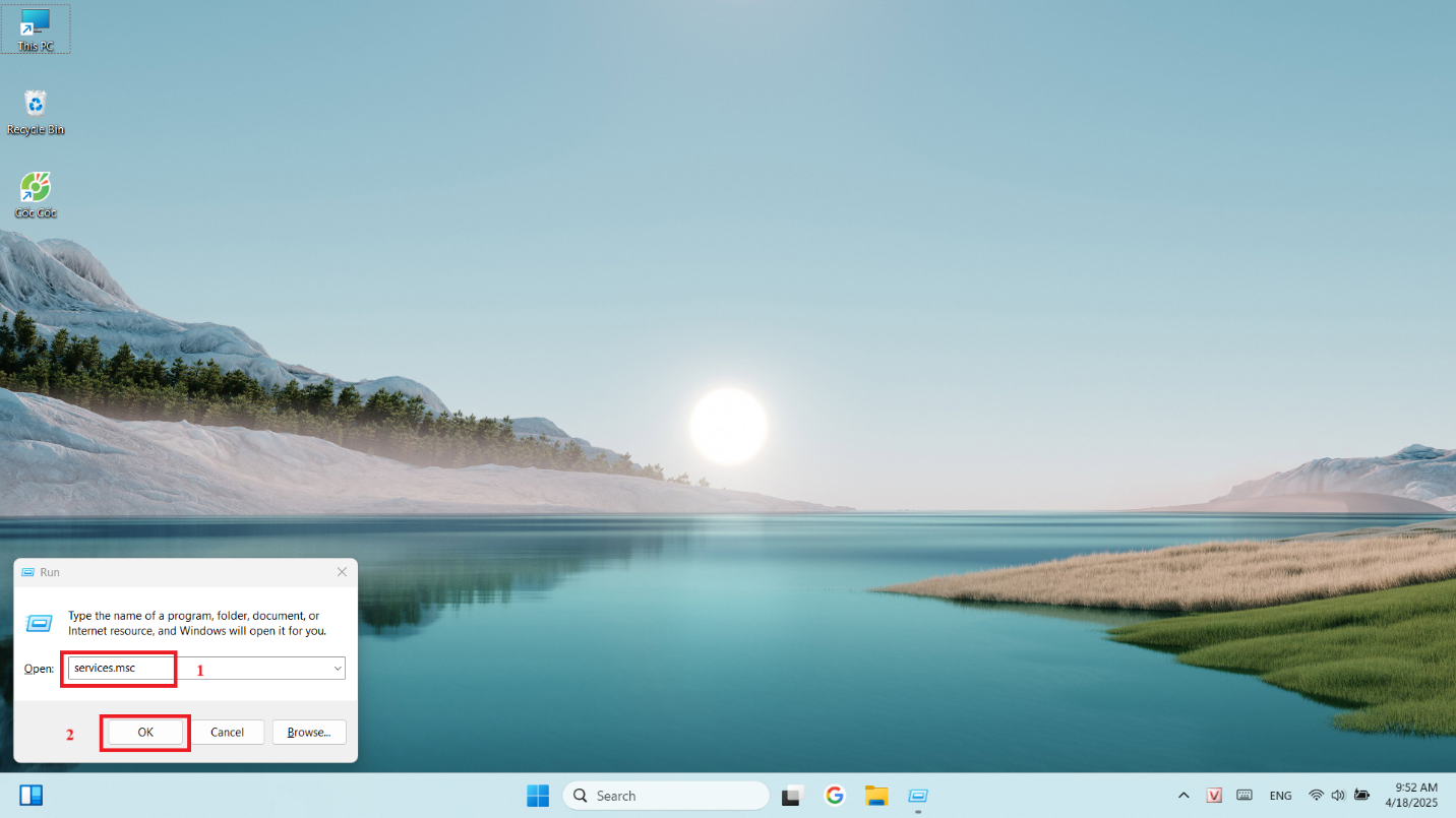 Nhấn tổ hợp phím “Ctrl + phím R” – Nhập “services.msc” – Nhấn “OK”