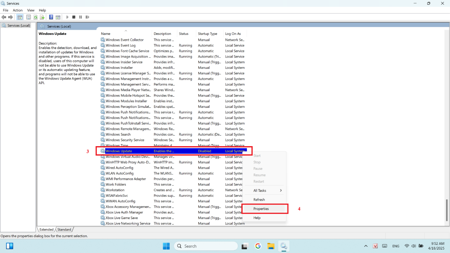 Tìm đến mục “Windows Update” – Kích chuột phải chọn “ Properties”