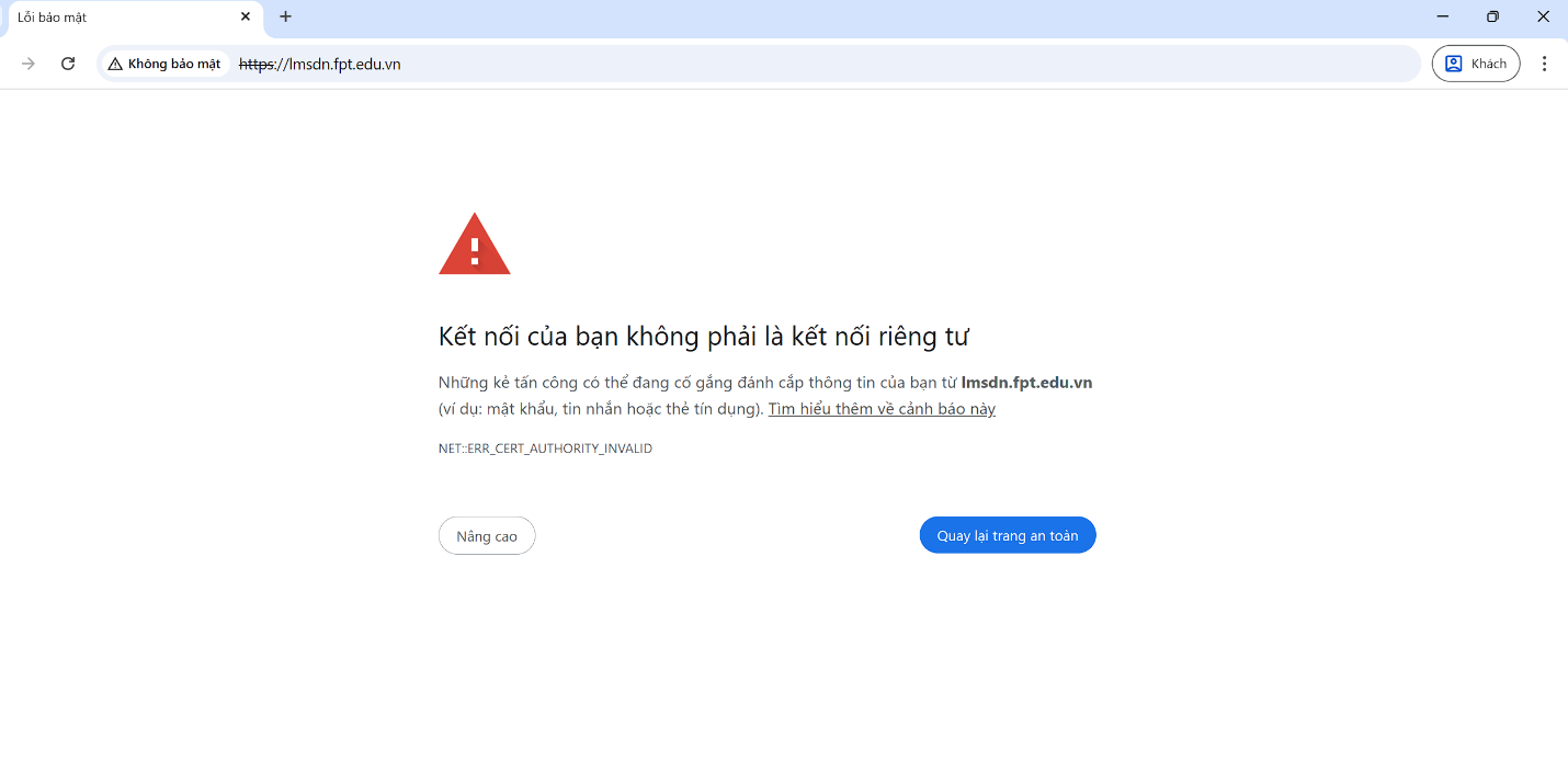 Khi các bạn truy cập vào lmsdn.fpt.edu.vn bằng Wifi Exam để làm bài quizz, nếu bị báo lỗi Không bảo mật/Kết nối không phải riêng tư (như hình) thì các bạn thực hiện lần lượt các bước sau để xử lý lỗi này nhé.