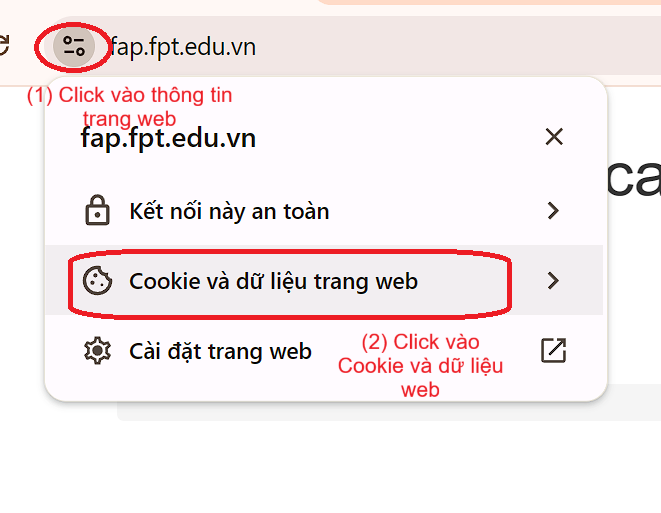- Ở trình duyệt web FAP đang bị lỗi, click lần lượt vào (1) thông tin trang web và (2) Cookie và dữ liệu trang web