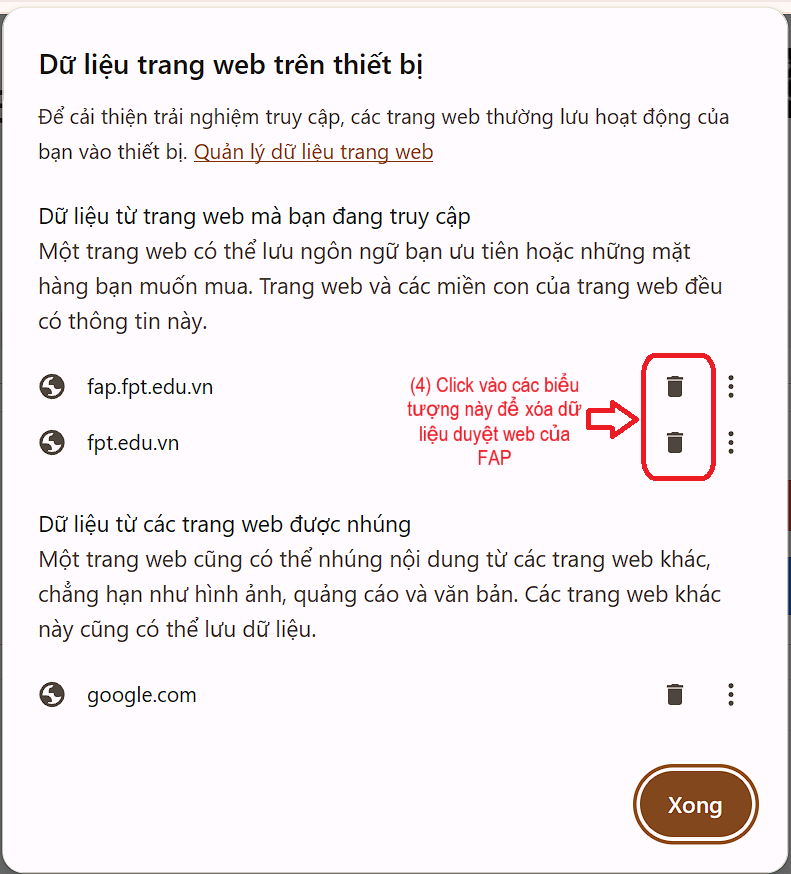 - Click vào các biểu tượng thùng rác để xóa dữ liệu duyệt web của FAP sau đó tắt và mở lại trình duyệt