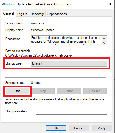 3. Ở cửa sổ Services tìm đến dịch vụ Windows Update, Click chuột phải chọn Properties, trên cửa sổ Windows Update Properties, phần Startup type, chọn Manual, sau đó click vào Start để chạy dịch vụ. Sau khi dịch vụ chạy hoàn tất thực hiện khởi động lại máy.