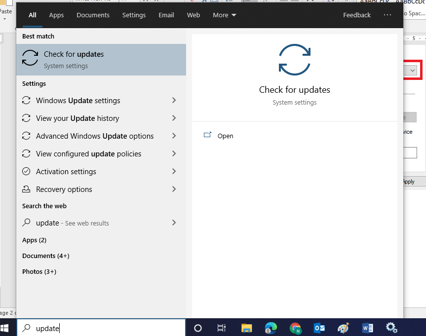 4. Sử dụng công cụ Search của Windows, nhập vào khung search Update, để tìm đến cửa sổ update Windows, chọn Check for Updates.
