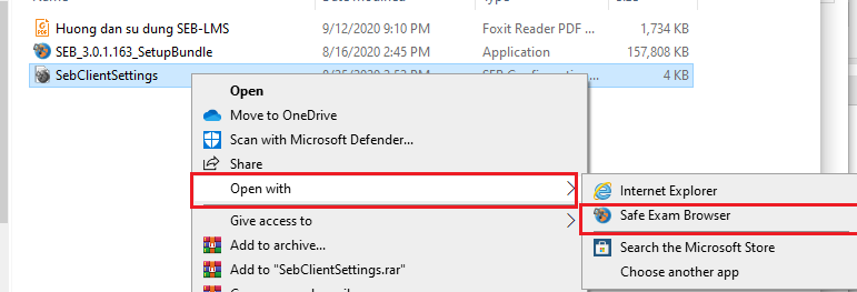 1. Sau khi đã giải nén, click chuột phải vào file cấu hình SebClientSetting chọn Open With ? chọn Safe Exam Browser để chạy file cấu hình, chọn Yes khi có yêu cầu. Đến đây, các bạn đã hoàn thành cài đặt phần mềm SEB. Tiếp tục đọc file hướng dẫn để vào được phần mềm và làm bài kiểm tra.