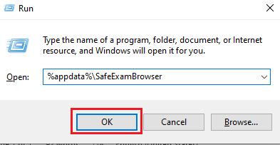 1. Dùng thanh công cụ Search của Windows hoặc tổ hợp phím WINDOWS+R để mở cửa sổ Run. Nhập %appdata%\SafeExamBrowser rồi bấm OK