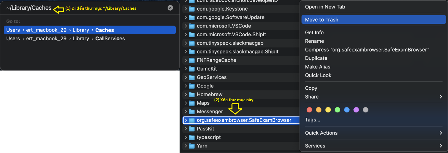 1. Đi đến thư mục Caches của hệ thống máy bằng cách nhập ~/Library/Caches (như hình). Sau đó xóa thư mục org.safeexambrowser.SafeExamBrowser (như hình)