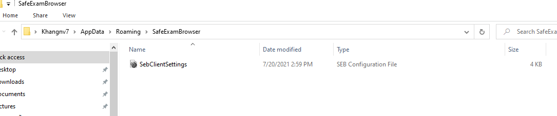 1. Xóa tất cả các File đang có trong thư mục này, sau đó copy file SebClientSettings từ thư mục  đã giải nén của phiên bản SEB mới vào thư mục này hoặc thực hiện lại bước chạy file cấu hình SebClientSettings từ thư mục SEB mới bằng cách bấm đúp vào file SebClientSettings.seb