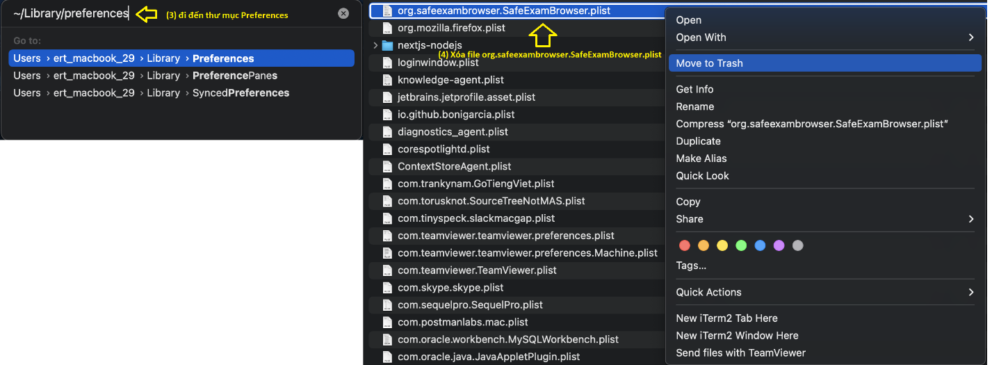 1. Đi đến thư mục Preferences của hệ thống máy bằng cách nhập ~/Library/preferences (như hình). Sau đó xóa thư mục org.safeexambrowser.SafeExamBrowser.plist (như hình)