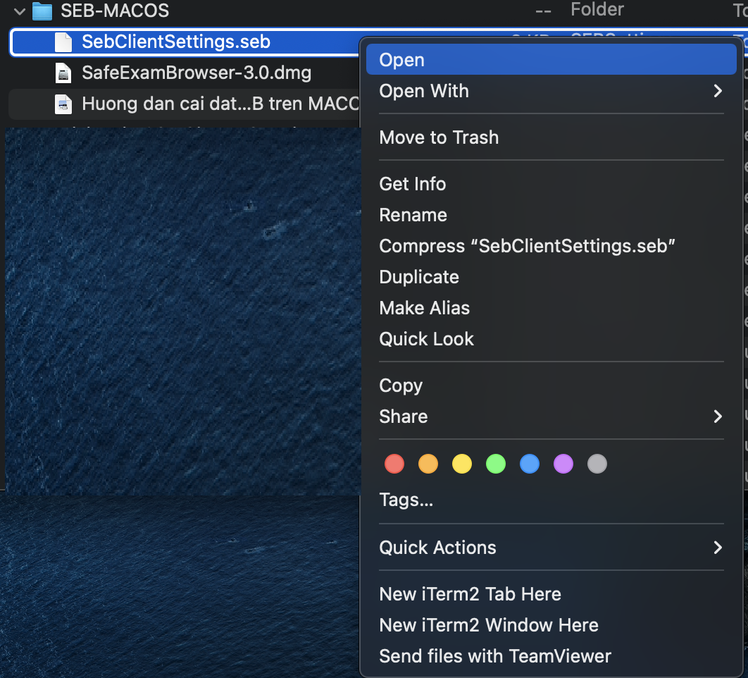 1. Chạy lại file cấu hình của SEB phiên bản mới bằng cách Click chuột phải vào file SebClientSetting.seb và chọn Open để hoàn tất cài đặt.